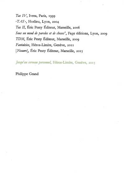 Les deux livres de Philippe Grand parus simultanément en 2015 et co-édités tous deux par les éditions Héros-Limite et Éric Pesty éditeur, correspondent respectivement à la première et à la troisième et dernière phase d’un travail d’écriture entamé il y a une trentaine d’années.