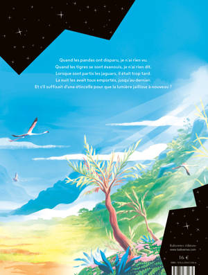 Quand les pandas ont disparu, je n’ai rien vu... Quand les tigres se sont évanouis, je n’ai rien dit... Quand sont partis les jaguars, il était trop tard. La nuit les avait tous emportés, jusqu’au dernier. Mais même seul au milieu des étoiles, la lumière peut rejaillir.