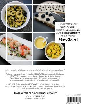 À la recherche d’idées pour cuisiner vite fait, bien fait et sans gaspillage ? Ce livre a été réalisé par la famille #ZEROGASPI, qui a lancé le Challenge JUST KEEP IT 21 jours sans gaspillage alimentaire (#JKIChallenge). Des milliers de personnes ont déjà découvert cette démarche soutenue par des journalistes et de nombreuses personnalités. "JUST KEEP IT : les recettes #ZEROGASPI", c’est du tout beau, tout bon. Le cake aux carottes et le larb khai sont des succès assurés ; la mousse au chocolat est une "tuerie", dixit nos voisins.