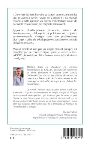 « Comment les êtres humains se traitent ou se maltraitent les uns les autres à travers l'usage de la nature ? » Ce manuel répond à cette question au travers d'illustrations issues de l'actualité récente (crise des migrants notamment). Approche pluridisciplinaire (économie, science de l'environnement, philosophie et politique) où la justice environnementale s'intègre dans une problématique plus large : celle du développement socialement durable (inégalités sociales).
