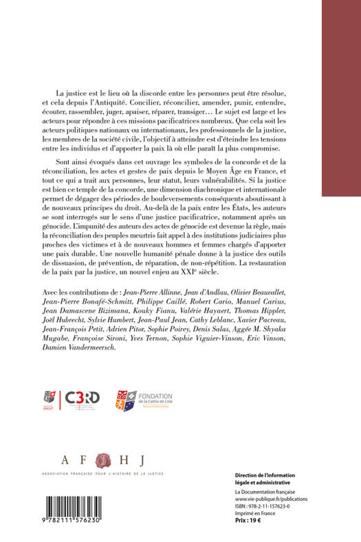 La justice est le lieu où la discorde entre les personnes peut être résolue, et cela depuis l’Antiquité. Concilier, réconcilier, amender, punir, entendre, écouter, rassembler, juger, apaiser, réparer, transiger... le sujet est large et les acteurs pour répondre à ces missions pacificatrices nombreux. Sont ainsi évoqués dans cet ouvrage : les symboles de la discorde et de la réconciliation, les actes et les gestes de paix depuis le Moyen Âge en France, et tout ce qui a trait aux personnes, leur statut, leurs vulnérabilités. Au-delà de la paix entre les Etats, les auteurs se sont interrogés sur le sens d’une justice pacificatrice notamment après un génocide. L’impunité des auteurs des actes de génocide est devenue la règle mais la réconciliation des peuples meurtris fait appel à des institutions judiciaires plus proches des victimes et à de nouveaux hommes et femmes chargés d’apporter une paix durable. Une nouvelle humanité pénale donne à la justice des outils de dissuasion, de prévention, de réparation, de non-répétition. La restauration de la paix par la justice, un nouvel enjeu au XXIe siècle ?