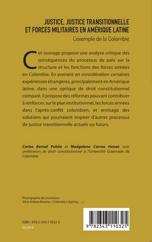 Cet ouvrage propose une analyse critique des conséquences du processus de paix sur la structure et les fonctions des forces armées en Colombie. En prenant en considération certaines expériences étrangères, principalement en Amérique latine, dans une optique de droit constitutionnel comparé, il propose des réformes pouvant contribuer à renforcer, sur le plan institutionnel, les forces armées dans l'après-conflit colombien, et envisage des solutions qui pourraient inspirer d'autres processus de justice transitionnelle actuels ou futurs.