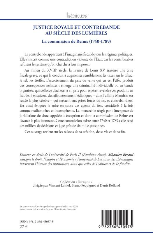 La contrebande appartient à l'imaginaire fiscal de tous les régimes politiques. Elle s'inscrit comme une contradiction violente de l'État, car les contribuables refusent le système qu'on cherche à leur imposer. Au milieu du XVIIIe siècle, la France de Louis XV traverse une crise fiscale grave, ce qui la conduit à augmenter sensiblement les taxes sur le tabac, le sel, les étoffes. L'accroissement du prix de vente qui en est l'effet produit des conséquences néfastes: émerge une criminalité individuelle ou en bande organisée, qui s'efforce d'acheter à vil prix pour espérer revendre ces produits en fraude. S'ensuivent des affrontements médiatiques - dont l'affaire Mandrin est restée la plus célèbre - qui mettent aux prises forces du fisc et contrebandiers. Est aussi évoquée la mise en cause des agents du fisc, considérés à la fois comme malhonnêtes et incompétents. La monarchie réagit par l'émergence de juridictions de choc, appelées d'exception et dont la commission de Reims est l'avatar le plus étonnant. Cette commission existe entre 1740 et 1789; elle rend des milliers de décisions et juge près de six mille personnes. Cet ouvrage revient sur les raisons de sa création, de sa vie et de sa fin.