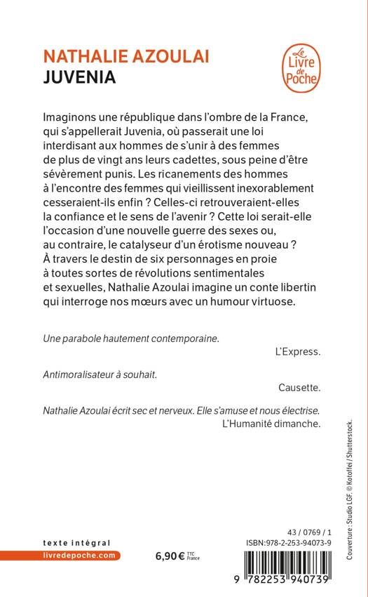 Imaginons une république dans l'ombre de la France, où passerait une loi interdisant aux hommes de s'unir à des femmes de plus de vingt ans leurs cadettes, sous peine d'être sévèrement punis. Et qui s'appellerait Juvenia. Les ricanements des hommes envers les femmes qui vieillissent inexorablement y cesseraient-ils enfin ? Celles-ci y retrouveraient-elles la confiance et le sens de l'avenir ? Cette loi serait-elle l'occasion d'une nouvelle guerre des sexes ou, au contraire, le catalyseur d'un érotisme nouveau ?