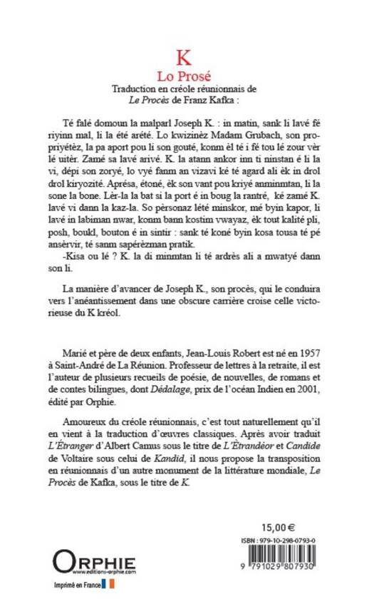 La manière d’avancer de Joseph K., son procès, qui le conduit vers l’anéantissement dans une obscure carrière qui croise celle victorieuse du K kréol. Une adaptation du Procès de F. Kafka.