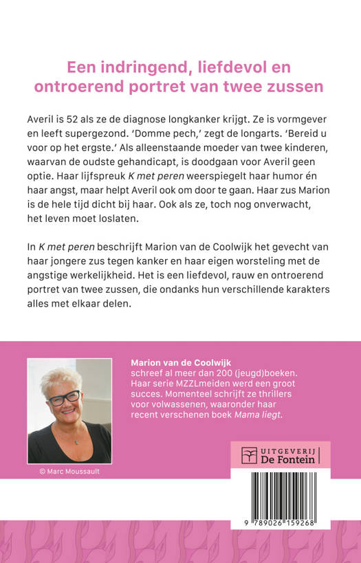 In K met peren beschrijft Marion van de Coolwijk het gevecht van haar jongere zus tegen kanker en haar eigen worsteling met de angstige werkelijkheid. Het is een liefdevol, rauw en ontroerend portret van twee zussen die ondanks hun verschillende karakters alles met elkaar delen.