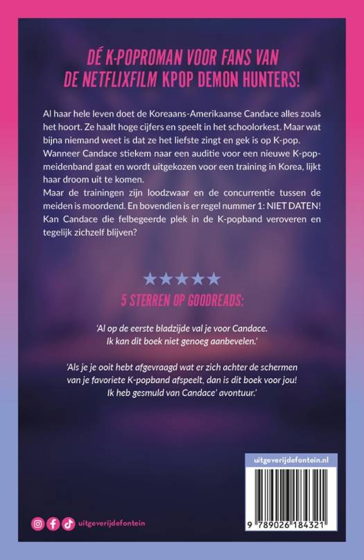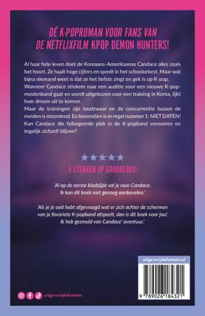 K-pop is niet meer te stoppen: van Seoul tot San Francisco tot Soest, het is uitgegroeid tot een wereldwijd cultureel fenomeen. De Netflixfilm KPop Demon Hunters is zelfs de meest gestreamde film ooit met meer dan 15 miljoen kijkers: hét bewijs dat deze trend miljoenen harten verovert. En nu is er de YA-roman die lezers meeneemt in diezelfde wereld. Candace Park lijkt het perfecte meisje, maar haar grootste droom is zangeres worden in een K-popband. Wanneer ze wordt toegelaten tot een exclusieve training in Korea ontdekt ze dat achter de glitter harde regels schuilgaan. En daten? Verboden. Maar hoe houd je dat vol met One.J en YoungBae in de buurt?
