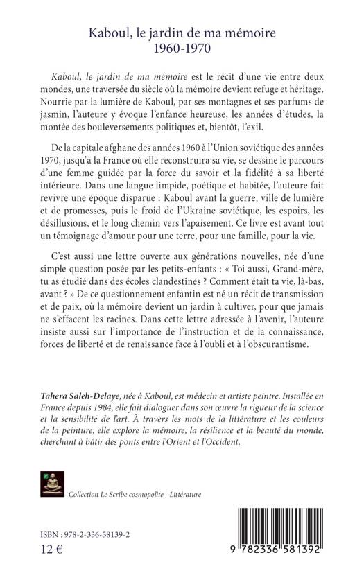 Kaboul, le jardin de ma mémoire est le récit d'une vie entre deux mondes, une traversée du siècle où la mémoire devient refuge et héritage. Nourrie par la lumière de Kaboul, par ses montagnes et ses parfums de jasmin, l'auteure y évoque l'enfance heureuse, les années d'études, la montée des bouleversements politiques et, bientôt, l'exil. De la capitale afghane des années 1960 à l'Union soviétique des années 1970, jusqu'à la France où elle reconstruira sa vie, se dessine le parcours d'une femme guidée par la force du savoir et la fidélité à sa liberté intérieure. Dans une langue limpide, poétique et habitée, l'auteure fait revivre une époque disparue: Kaboul avant la guerre, ville de lumière et de promesses, puis le froid de l'Ukraine soviétique, les espoirs, les désillusions, et le long chemin vers l'apaisement. Ce livre est avant tout un témoignage d'amour pour une terre, pour une famille, pour la vie. C'est aussi une lettre ouverte aux générations nouvelles, née d'une simple question posée par les petits-enfants: Toi aussi, Grand-mère, tu as étudié dans des écoles clandestines ? Comment était ta vie, là-bas, avant ? De ce questionnement enfantin est né un récit de transmission et de paix, où la mémoire devient un jardin à cultiver, pour que jamais ne s'effacent les racines. Dans cette lettre adressée à l'avenir, l'auteure insiste aussi sur l'importance de l'instruction et de la connaissance, forces de liberté et de renaissance face à l'oubli et à l'obscurantisme.
