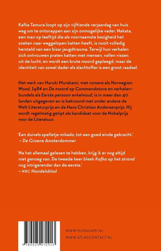 Kafka Tamura loopt op zijn vijftiende verjaardag weg van huis om te ontsnappen aan zijn onmogelijke vader. Satoru Nakata is een gehandicapte man op leeftijd, die als voornaamste bezigheid het zoeken naar weggelopen katten heeft en nooit volledig hersteld is van een bizar jeugdtrauma. Terwijl hun verhalen zich ontvouwen praten katten met mensen, vallen vissen uit de lucht, en wordt een brute moord gepleegd, maar de identiteit van zowel dader als slachtoffer is een groot raadsel.