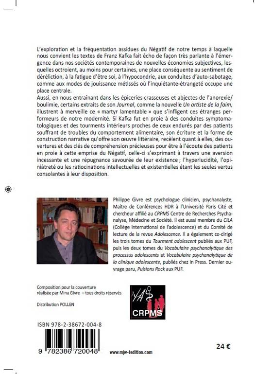 Les secrets de Franz Kafka, amoureuses, familiales et surtout alimentaires. L'auteur expliquera que tout est lié. L'ouvrage permet aussi de mieux comprendre les secrets de l'anorexie et des troubles alimentaires. De façon plus générale, les nouvelles subjectivités de notre société contemporaines sont explorées.