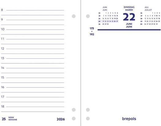 Brepols dagomlegblok 2-talig (NL-F) met telkens 1 dag op 2 pagina's op wit papier op formaat 8,4 x 12 cm. Het omlegblok is voorzien van een ponsing waardoor deze netjes blijft liggen.