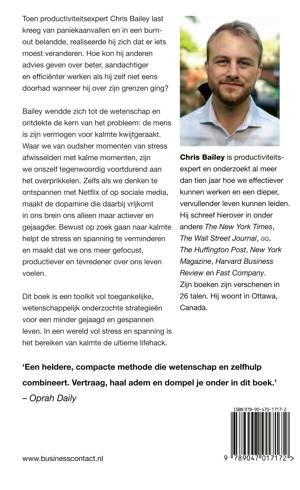 Toen succesvol productiviteitsexpert Chris Bailey last kreeg van paniekaanvallen en in een burn-out belandde, realiseerde hij zich dat er iets moest veranderen. Hoe kon hij anderen advies geven over beter, aandachtiger en efficiënter werken als hij zelf niet eens doorhad wanneer hij over zijn grenzen ging? Bailey wendde zich tot de wetenschap en ontdekte de kern van het probleem: de mens is zijn vermogen voor kalmte kwijtgeraakt. Waar we van oudsher momenten van stress afwisselden met kalme momenten, zijn we onszelf tegenwoordig voortdurend aan het overprikkelen. Zelfs als we denken te ontspannen met Netflix of op sociale media, maakt de dopamine die daarbij vrijkomt in ons brein ons alleen maar actiever en gejaagder. Bewust op zoek gaan naar kalmte helpt de stress en spanning te verminderen en maakt dat we ons meer gefocust, productiever en tevredener over ons eigen leven voelen. Dit boek is een toolkit vol toegankelijke, wetenschappelijk onderzochte strategieën voor een minder gejaagd en gespannen leven. In een wereld vol stress en spanning is het bereiken van kalmte de ultieme lifehack.