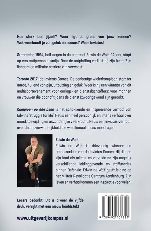 Srebrenica 1994, half negen in de ochtend. Edwin de Wolf, 24 jaar, stapt op een antipersoneelsmijn. Door de ontploffing verliest hij zijn been. Zijn lichaam en militaire carrière zijn verwoest. Toronto 2017: de Invictus Games. De eenbenige wielerkampioen stort ter aarde, huilend van pijn, uitputting en geluk. Weer is hij een winnaar van dit multi-sportevenement voor oorlogs- en dienstslachtoffers: voor mannen en vrouwen die door of tijdens de dienst (zwaar)gewond zijn geraakt.