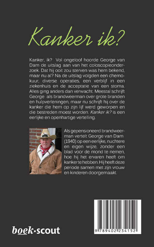 Kanker, ik? Vol ongeloof hoorde George van Dam de uitslag aan van het coloscopieonderzoek. Dat hij ooit zou sterven was hem bekend, maar nu al? Na de uitslag volgden een chemokuur, diverse operaties, een verblijf in een ziekenhuis en de acceptatie van een stoma. Alles ging anders dan verwacht. Meestal schrijft George als brandweerman over grote branden en hulpverleningen, maar nu schrijft hij over de kanker die hem op zijn lijf werd geworpen en die bestreden moest worden. Kanker ik? is een eerlijke en openhartige vertelling.