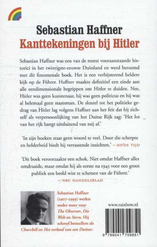 Sebastian Haffner was een van de meest vooraanstaande historici in het twintigste-eeuwse Duitsland en werd beroemd met dit fenomenale boek. Het is een verbijsterend heldere kijk op de Führer. Haffner maakte de?nitief een einde aan alle ééndimensionale begrippen om Hitler te duiden. Nee, Hitler was geen kunstenaar, hij was geen politicus en hij was al helemaal geen staatsman. De sleutel tot het politieke gedrag van Hitler lag volgens Haffner aan het feit dat hij zichzelf als verpersoonlijking van het Duitse Rijk zag: 'Het lot van het rijk hangt uitsluitend van mij af.'Kanttekeningen bij Hitler is een analyse van het verschijnsel Hitler vanuit verschillende invalshoeken.'In zijn boeken staat geen woord te veel. En door die scherpte en helderheid biedt hij verrassende inzichten.' HP/DE TIJD'Dit boek veroorzaakte een schok. Niet omdat Haffner alles omdraaide, maar omdat hij als eerste na 1945 voor een groot publiek een beeld wist te schetsen van de Führer.' NRC HANDELSBLAD