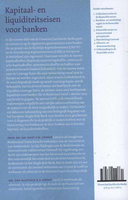 In dit nieuwe deel van de Financieel Juridische Reeks gaan de auteurs in op de eigenvermogensvereisten voor banken die op grond van de Richtlijn Kapitaalvereisten (CRD IV) en de Verordening Kapitaalvereisten (CRR) in Europa en in Nederland zijn ingevoerd. Daarnaast worden de nieuwe kapitaalbuffers (kapitaalconserveringsbuffer, contracyclische kapitaalbuffer, systeemrisicobuffer en buffers voor systeemrelevante banken) behandeld. Ook de nieuwe norm voor de Leverage Ratio die naar verwachting vanaf 2018 in Europa zal worden ingevoerd, maar waarin in Nederland in de toezichtpraktijk reeds op wordt vooruitgelopen, wordt behandeld. Het boek bevat tevens een hoofdstuk over de Liquidity Coverage Ratio, de nieuwe norm voor kortlopende liquiditeit voor banken die in Nederland vanaf 1 oktober 2015 van kracht gaat. De auteurs hebben de materie toegelicht met talrijke rekenvoorbeelden om de materie voor de lezer toegankelijk te maken. Dit boek bevat aldus een behandeling van een belangrijk fragment van het Europese Single Rule Book voor banken en is geschreven voor al diegenen die in de praktijk te maken hebben met de financiering van banken en de door banken aan te houden kapitaalbuffers.