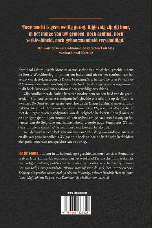 Over de rol van verzetsheld Mercier en de kerk in WOI 'Deze macht is geen wettig gezag. Bijgevolg zijt gij haar, in het innige van uw gemoed, noch achting, noch verkleefdheid, noch gehoorzaamheid verschuldigd.' Uit: Patriotisme et Endurance, de kerstbrief uit 1914 van kardinaal Mercier Kardinaal Désiré-Joseph Mercier, aartsbisschop van Mechelen, groeide tijdens de Eerste Wereldoorlog in binnen- en buitenland uit tot het symbool van het verzet van de Belgen tegen de Duitse bezetting. Zijn herderlijke brief Patriotisme et Endurance van Kerstmis 1914, die in de Nederlandstalige versie is opgenomen in dit boek, kreeg ook internationaal een geweldige weerklank. Zijn conflict met de Duitse bezetter maakte hem tot een held van de geallieerden. Zijn patriottische standpunt beïnvloedde ook zijn kijk op de 'Vlaamse kwestie'. De Duitsers wisten niet goed hoe ze die lastige kardinaal moesten aanpakken. Maar ook de toenmalige paus, Benedictus XV, was niet altijd gediend met de uitgesproken standpunten van de Belgische kerkvorst. Terwijl Mercier de oorlogsinspanningen steunde als een rechtvaardige zaak met het oog op het herstel van de Belgische onafhankelijkheid, vreesde paus Benedictus XV dat deze 'nutteloze slachting' de 'zelfmoord van Europa' betekende. Aan de hand van een kritische analyse van de houding van kardinaal Mercier en die van paus Benedictus XV gaat dit boek na hoe de katholieke kerkleiders zich positioneerden ten opzichte van de oorlog.