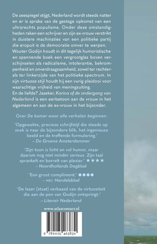 In de roman ‘Karina of de ondergang van Nederland’ van Wouter Godijn stijgt de zeespiegel, wordt Nederland steeds natter en is er sprake van de gestage opkomst van een ultrarechts populisme. Onder deze omstandigheden raken een schrijver en zijn ex-vrouw verstrikt in duistere machinaties van een politieke partij die eropuit is de democratie omver te werpen. Wouter Godijn houdt in dit tegelijk humoristische en spannende boek een vergrootglas boven verschijnselen als radicalisme, intolerantie, bekrompenheid en onverdraagzaamheid, zowel ter rechter- als ter linkerzijde van het politieke spectrum. In zijn virtuoze stijl houdt hij een vurig pleidooi voor waarachtige vrijheid van meningsuiting. En de liefde? Jazeker, ‘Karina of de ondergang van Nederland’ is een eerbetoon aan de vrouw in het algemeen en aan de ex-vrouw in het bijzonder.