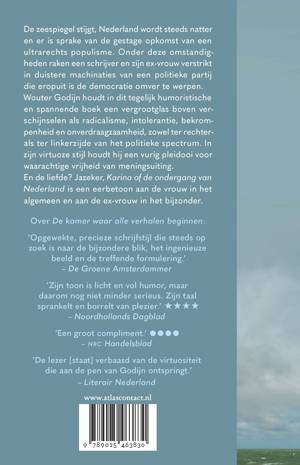In de roman 'Karina of de ondergang van Nederland' van Wouter Godijn stijgt de zeespiegel, wordt Nederland steeds natter en is er sprake van de gestage opkomst van een ultrarechts populisme. Onder deze omstandigheden raken een schrijver en zijn ex-vrouw verstrikt in duistere machinaties van een politieke partij die eropuit is de democratie omver te werpen. Wouter Godijn houdt in dit tegelijk humoristische en spannende boek een vergrootglas boven verschijnselen als radicalisme, intolerantie, bekrompenheid en onverdraagzaamheid, zowel ter rechter- als ter linkerzijde van het politieke spectrum. In zijn virtuoze stijl houdt hij een vurig pleidooi voor waarachtige vrijheid van meningsuiting. En de liefde? Jazeker, 'Karina of de ondergang van Nederland' is een eerbetoon aan de vrouw in het algemeen en aan de ex-vrouw in het bijzonder.