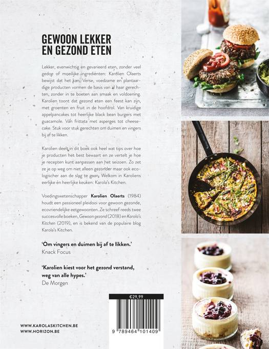 Een evenwichtige en gevarieerde maaltijd die makkelijk te bereiden en ook lekker is? Karolien Olaerts bewijst dat het kan. Verse, voedzame en plantaardige ingrediënten vormen de basis van al haar gerechten, zonder in te boeten aan smaak en voldoening. Van kruidige appelpancakes tot geroosterde pompoen met feta. Van een auberginestoofpotje met orzo tot banaansoufflé. Ze geeft ook tips om zo weinig mogelijk voedsel te verspillen en vertelt hoe je seizoensgebonden producten kunt vervangen of een vegan versie kunt maken. Welkom in Karoliens eerlijke én heerlijke keuken: Karola's Kitchen.