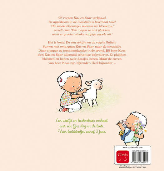 Het is lente. De zon schijnt en de vogels fluiten. Samen met oma gaan Kas en Saar naar de moestuin. Daar stoppen ze tomatenplantjes in de grond. Bij boer Koos zien Kas en Saar allemaal schattige babydieren. Ze kopen eieren en plukken mooie bloemen. Maar de eieren van boer Koos zijn bijzonder. Heel bijzonder …
