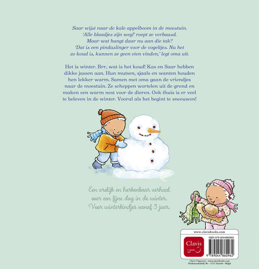 Het is winter. Brr, wat is het koud! Kas en Saar hebben dikke jassen aan. Hun mutsen, sjaals en wanten houden hen lekker warm. Samen met oma gaan de vriendjes naar de moestuin. Ze scheppen wortelen uit de grond en maken een warm nest voor de dieren. Ook thuis is er veel te beleven in de winter. Vooral als het begint te sneeuwen!