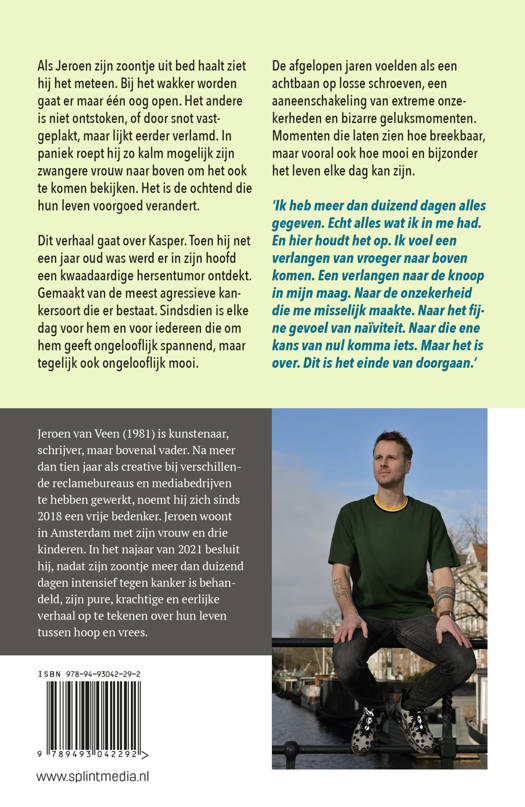 Als Jeroen zijn zoontje uit bed haalt ziet hij het meteen. Bij het wakker worden gaat er maar één oog open. Het andere is niet ontstoken, of door snot vastgeplakt, maar lijkt eerder verlamd. In paniek roept hij zo kalm mogelijk zijn zwangere vrouw naar boven om het ook te komen bekijken. Het is de ochtend die hun leven voorgoed verandert. Dit verhaal gaat over Kasper. Toen hij net een jaar oud was werd er in zijn hoofd een kwaadaardige hersentumor ontdekt. Gemaakt van de meest agressieve kankersoort die er bestaat. Sindsdien is elke dag voor hem en voor iedereen die om hem geeft ongelooflijk spannend, maar tegelijk ook ongelooflijk mooi. De afgelopen jaren voelden als een achtbaan op losse schroeven, een aaneenschakeling van extreme onzekerheden en bizarre geluksmomenten. Momenten die laten zien hoe breekbaar, maar vooral ook hoe mooi en bijzonder het leven elke dag kan zijn. ‘Ik heb meer dan duizend dagen alles gegeven. Echt alles wat ik in me had. En hier houdt het op. Ik voel een verlangen van vroeger naar boven komen. Een verlangen naar de knoop in mijn maag. Naar de onzekerheid die me misselijk maakte. Naar het fijne gevoel van naïviteit. Naar die ene kans van nul komma iets. Maar het is over. Dit is het einde van doorgaan.’Jeroen van Veen (1981) is kunstenaar, schrijver, maar bovenal vader. Na meer dan tien jaar als creative bij verschillende reclamebureaus en mediabedrijven te hebben gewerkt, noemt hij zich sinds 2018 een vrije bedenker. Jeroen woont in Amsterdam met zijn vrouw en drie kinderen. In het najaar van 2021 besluit hij, nadat zijn zoontje meer dan duizend dagen intensief tegen kanker is behandeld, zijn pure, krachtige en eerlijke verhaal op te tekenen over hun leven tussen hoop en vrees.