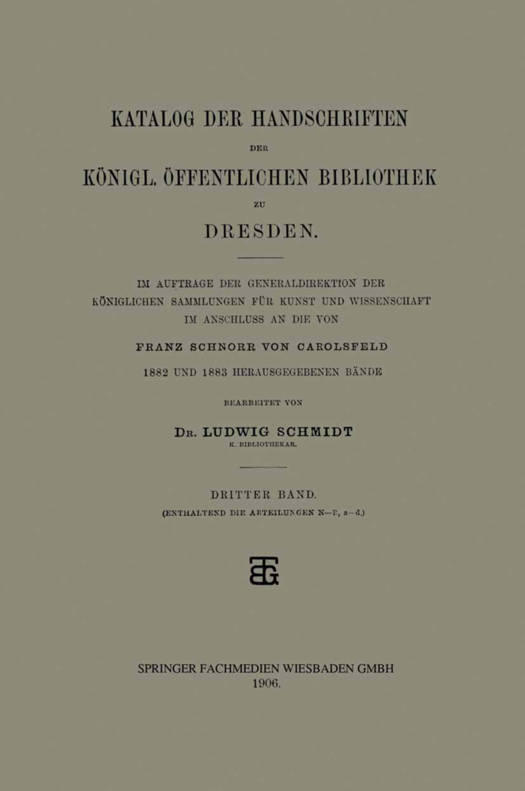 Der vorliegende dritte Band des Dresdner Handschriften- katalogs folgt auf die beiden ersten nach einer längeren Zwischen- zeit, als ursprünglich vorausgesehen werden konnte. Diese Ver- zögerung ist durch Umstände verschiedener Art bewirkt worden: einmal dadurch, daß zunächst die zeitraubende und mühevolle Katalogisierung der umfänglichen handschriftlichen Korrespon- denzen, insbesondere der großen Böttigerschen Briefsammlung, in Angriff genommen wurde, ferner durch die im Jahre 1885 erfolgte Einverleibung der Oelser Schloßbibliothek und durch die Be- rufung des Bearbeiters der beiden ersten Bände zum Vorstand der Königl. Bibliothek. Die hier verzeichneten Handschriften ent- stammen zum großen Teile noch den alten Beständen, so nament- lich die Abteilungen 0 und Pj einen wesentlichen Bestandteil aber machen auch die 1853 und 1854 erfolgten erheblichen Ab- lieferungen des Königl. Sächsischen Hauptstaatsarchivs aus: Die noch ausstehenden wenigen und nicht umfänglichen Abteilungen, zusammen höchstens etwa 600 Nummern enthaltend, setzen sich in der Hauptsache aus Erwerbungen der neueren und neuesten Zeit zusammen, unter denen die Handschriften der Oelser Biblio- thek einen größeren Raum einnehmen. Für diesen Rest ist die Ausgabe eines Supplementheftes zum Handschriftenkatalog geplant; hier sollen auch die in der Musikabteilung aufgestellten Auto- graphen, insbesondere die der 1896 einverleibten Königl. Privat- musikaliensammlung entstammenden Originalmanuskripte, für die, abgesehen von den Anführungen in Rob. Eitners Biographisch- bibliographischem Lexikon der Musiker und Musikgelehrten (10 Bände, Leipzig 1900-1904), ein gedrucktes Verzeichnis noch nicht vorhanden ist 1), sowie die im Vorbericht zu Band I S.