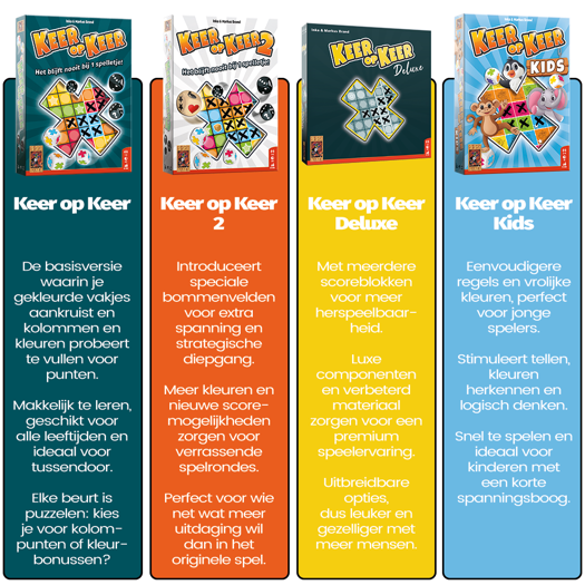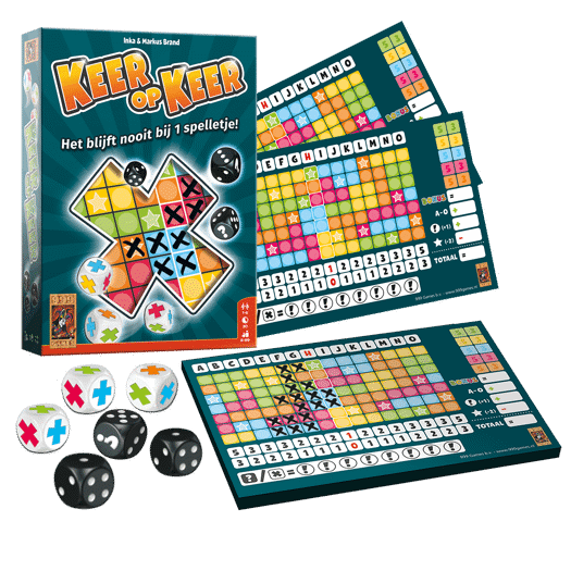 Maak steeds de juiste keuze en probeer de door de andere spelers gewenste combinatie weg te nemen. Je keuzemogelijkheden stijgen als je je speelveld verstandig uitbreidt. Naast punten voor complete kolommen krijg je ook een bonus als je alle vakjes van 1 kleur hebt aangekruist. Het spel is afgelopen als een speler 2 complete kleuren heeft aangekruist. Wie heeft de meeste punten?
