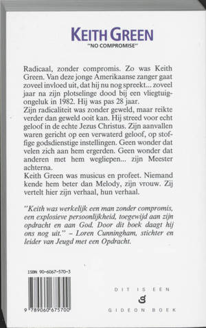 Radicaal, zonder compromis. Zo was Keith Green. Van deze jonge zanger gaat zoveel invloed uit, dat hij nu nog spreekt... zoveel jaar na zijn dood bij een vliegtuigongeluk in 1982. Hij was pas 28 jaar. Zijn radicaliteit was zonder geweld, maar eikte verder dan geweld ooit kan. Hij streed voor echt geloof in de echte Jezus Christus. Zijn aanvallen waren gericht op een verwaterd geloof, op stoffige godsdienstige instellingen. Geen wonder dat velen zich aan hem ergerden. Geen wonder dat anderen met hem wegliepen... zijn Meester achterna. Keith Green was musicus en profeet. Niemand kende hem beter dan Melody, zijn vrouw. Zij vertelt hier zijn verhaal, hun verhaal.
