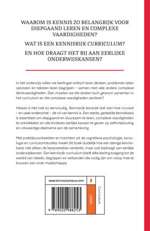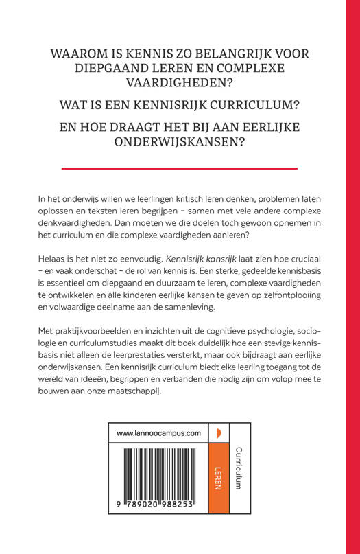 Waarom is kennis zo belangrijk voor diepgaand leren en complexe vaardigheden? Wat is een kennisrijk curriculum? En hoe draagt het bij aan eerlijke onderwijskansen? In het onderwijs willen we leerlingen kritisch leren denken, problemen laten oplossen en teksten leren begrijpen - samen met vele andere complexe denkvaardigheden. Dan moeten we die doelen toch gewoon opnemen in het curriculum en die complexe vaardigheden aanleren? Helaas is het niet zo eenvoudig. Kennisrijk kansrijk laat zien hoe cruciaal - en vaak onderschat - de rol van kennis is. Een sterke, gedeelde kennisbasis is essentieel om diepgaand en duurzaam te leren, complexe vaardigheden te ontwikkelen en alle kinderen eerlijke kansen te geven op zelfontplooiing en volwaardige deelname aan de samenleving. Met praktijkvoorbeelden en inzichten uit de cognitieve psychologie, sociologie en curriculumstudies maakt dit boek duidelijk hoe een stevige kennisbasis niet alleen de leerprestaties versterkt, maar ook bijdraagt aan eerlijke onderwijskansen. Een kennisrijk curriculum biedt elke leerling toegang tot de wereld van ideeën, begrippen en verbanden die nodig zijn om volop mee te bouwen aan onze maatschappij.