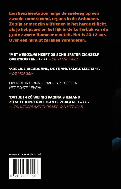 ‘Kerozine’ van Adeline Dieudonné speelt zich af rond een benzinestation langs de snelweg op een zwoele zomeravond, ergens in de Ardennen. Ze zijn er met zijn vijftienen in het harde tl-licht, als je het paard en het lijk in de kofferbak van de grote zwarte Hummer meetelt. Zo is er Juliette, de caissière, en haar collega Sébastien, die met Mauricio is getrouwd. En Alika, een Filipijnse nanny, Chelly, een lerares paaldansen, Joseph, die handelsreiziger is in roofmijten... Het is 23.12 uur. Over een minuut zal alles veranderen. Dan wordt ieder van hen de held van zijn eigen verhaal, en soms lopen hun verhalen door elkaar. Een mozaïekroman die je doet lachen en huilen, of je doet huilen van het lachen om de absurditeit van het leven.