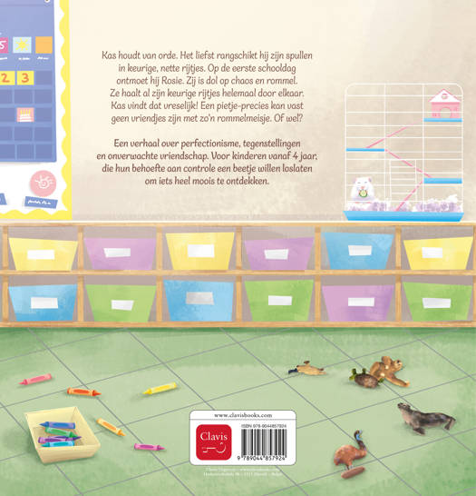 Kas houdt van orde. Het liefst rangschikt hij zijn spullen in keurige, nette rijtjes. Op de eerste schooldag ontmoet hij Rosie. Zij is dol op chaos en rommel. Ze haalt al zijn keurige rijtjes helemaal door elkaar. Kas vindt dat vreselijk! Een pietje-precies kan vast geen vriendjes zijn met zo’n rommelmeisje. Of wel?