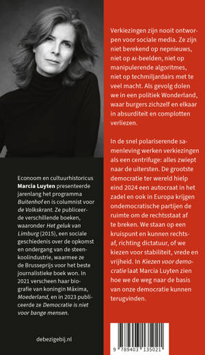 In de snel polariserende samenleving werken verkiezingen als een centrifuge: alles zwiept naar de uitersten. De grootste democratie ter wereld hielp eind 2024 een autocraat in het zadel en ook in Europa krijgen ondemocratische partijen de ruimte om de rechtsstaat af te breken. We staan op een kruispunt en kunnen rechtsaf, richting dictatuur, of we kiezen voor stabiliteit, vrede en vrijheid. In Kiezen voor democratie laat Marcia Luyten zien hoe we de weg naar de basis van onze democratie kunnen terugvinden.