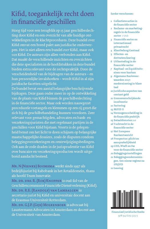 Hoog tijd voor een terugblik op 15 jaar geschilbeslechting door Kifid en een overzicht van alle huidige ontwikkelingen in de klachtprocedures. Deze bundel over Kifid omvat een breed palet aan juridische onderwerpen. Het is niet alleen een bundel over Kifid, maar ook van Kifid. De auteurs zijn allen verbonden aan Kifid. Dat maakt de verschillende inzichten en overzichten die deze specialisten in de hoofdstukken in deze bundel bieden extra relevant voor de rechtspraktijk. Door de verscheidenheid van de bijdragen van de auteurs – en hun persoonlijke invalshoeken – wordt Kifid in al zijn juridische facetten uitgelicht. De bundel bevat een aantal belangrijke beschrijvende bijdragen. Deze gaan onder meer in op de ontwikkeling van de plaats van Kifid binnen de geschilbeslechting in de financiële sector. Maar ook worden nauwgezet procedurele voetangels en klemmen op een rij gezet die zich bij de geschilbehandeling kunnen voordoen. Zeer relevant voor gemachtigden, advocaten en bank- en verzekeringsjuristen die met regelmaat partijen in de geschillen voor Kifid bijstaan. Voorts is de gelegenheid benut om het licht te doen schijnen op belangrijke maatschappelijke dossiers, zoals de disputen rondom beleggingsverzekeringen en rentewijzigingsbedingen. Ook aan de rode draden in de jurisprudentie van Kifid over bancaire en verzekeringsproducten wordt uitgebreid aandacht besteed.