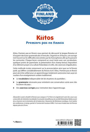 Cette méthode insiste notamment sur la prononciation ainsi que sur le finnois parlé, qui diffère considérablement du finnois écrit. Kiitos - Premiers pas en finnois peut ainsi être utilisé pour un apprentissage totalement autonome mais aussi en soutien d’un enseignement scolaire traditionnel.