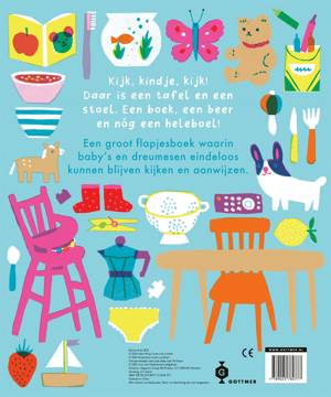 Het babyboek heeft een groot formaat en stevige flappen, bestand tegen veelvuldig lezen en kijken. Het bevat meer dan honderd alledaagse voorwerpen voor dreumesen om te herkennen, aan te wijzen en over te praten - gerangschikt op thema's als de keuken, de badkamer en de slaapkamer.