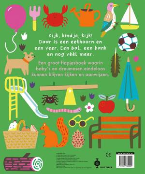 Dit stevige prentenboek is het ideale hulpmiddel bij het opbouwen van de woordenschat van dreumesen. Een aanwijsboek is een leuke manier om woordjes met je kindje te oefenen. In 'Kijk, kindje, kijk - Buiten' kunnen kinderen allerlei concepten ontdekken, benoemen en herkennen die ze tegenkomen als ze gaan buiten spelen. Een emmer en een schep bijvoorbeeld, een vogel in een huisje of een schommel en een hond.