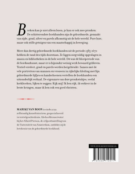 Meer dan dertig geborduurde boekbanden uit de periode 1585-1670 hebben de tand des tijds doorstaan. Ze liggen zorgvuldig opgeslagen in musea en bibliotheken in de hele wereld. Dit was dé bloeiperiode van de borduurkunst, maar er is bijzonder weinig werk bewaard gebleven.