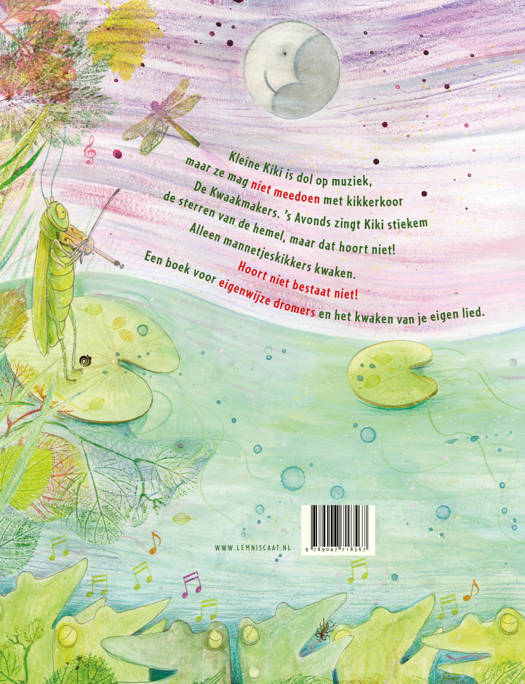 Maar Kiki zingt ook graag. Dat hoort niet, vindt de kikkerdirigent, dus Kiki zingt alleen voor zichzelf, voor de maan en voor de krekel die viool speelt.