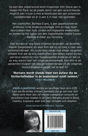 Op een late zomeravond komt inspecteur Kim Stone aan in Haden Hill Park, bij de plaats delict van een verschrikkelijk misdrijf: een vrouw is met prikkeldraad aan een schommel vastgebonden er is een X in haar nek gesneden. Het slachtoffer, Belinda Evans, is een gepensioneerde professor in de kinderpsychologie. Kim en haar team doorzoeken haar huis, vinden een ingepakte weekendtas en komen op het spoor van een ingewikkelde relatie tussen Belinda en haar zus Veronica. Dan worden er nog twee lichamen gevonden, op dezelfde manier toegetakeld, en weet Kim dat ze op zoek is naar een seriemoordenaar. Als ze de zaken met elkaar vergelijkt, ontdekt Kim dat de drie slachtoffers betrokken waren bij een jaarlijkse wedstrijd voor hoogbegaafde kinderen en dat ze op weg waren naar het volgende evenement. Kan Kim in de gedachten kruipen van een seriemoordenaar en de volgende moord stoppen voordat het te laat is? In de pers 'Goed tempo en met de nodige cliffhangers. Een policier zoals een policier hoort te zijn.'**** VN Detective & Thrillergids 'De policiers die ze schrijft zijn ronduit verslavend. Mooie verrassende draai in het geheel, die de lezer tot op het laatst op het puntje van zijn stoel houdt.' **** De Telegraaf 'Ook na tien jaar Kim Stone is de magie nog steeds niet uitgewerkt.' de Boekenkrant "...De Kim Stone-serie is écht een must read voor elke thrillerliefhebber..." Thrillzone.nl 'Angela Marsons blijft verrassen met onverwachte plotwendingen en na het lezen van Kinderspel wordt duidelijk dat het verhaal van Kim Stone en haar team nog lang niet af is' .vrouwenthrillers.nl 'Wat deze serie zo sterk maakt, is de groeiende band met de personages. Ze voelen als familie, en Marsons blijft hen verder ontwikkelen, waardoor de boeken keer op keer weten te boeien. Kinderspel is een meesterlijke toevoeging aan een al sterke reeks.' CooleSuggesties.nl