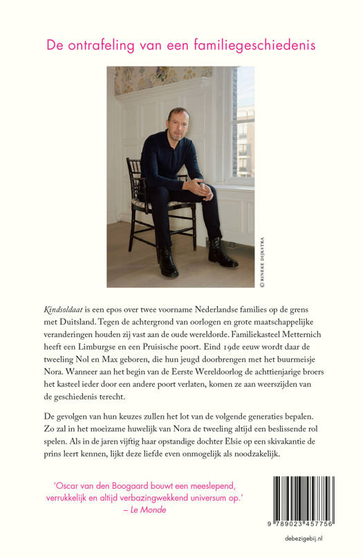 Kindsoldaat is een epos over twee voorname Nederlandse families op de grens met Duitsland. Tegen de achtergrond van oorlogen en grote maatschappelijke veranderingen houden zij vast aan de oude wereldorde. Familiekasteel Metternich heeft een Limburgse en een Pruisische poort. Eind 19de eeuw wordt daar de tweeling Nol en Max geboren, die hun jeugd doorbrengen met het buurmeisje Nora. Wanneer aan het begin van de Eerste Wereldoorlog de achttienjarige broers het kasteel ieder door een andere poort verlaten, komen ze aan weerszijden van de geschiedenis terecht.