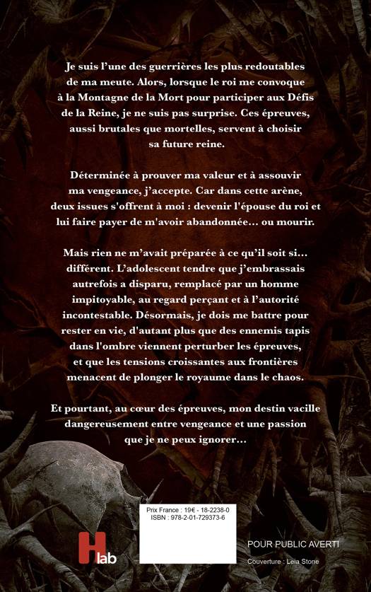 Je suis l’une des guerrières les plus redoutables de ma meute. Alors, lorsque le roi me convoque à la Montagne de la Mort pour participer aux Défis de la Reine, je ne suis pas surprise. Ces épreuves, aussi brutales que mortelles, servent à choisir sa future reine. Déterminée à prouver ma valeur et à assouvir ma vengeance, j’accepte. Car dans cette arène, deux issues s'offrent à moi : devenir l'épouse du roi et lui faire payer de m'avoir abandonnée… ou mourir. Mais rien ne m’avait préparée à ce qu’il soit si… différent. L’adolescent tendre que j’embrassais autrefois a disparu, remplacé par un homme impitoyable, au regard perçant et à l’autorité incontestable. Désormais, je dois me battre pour rester en vie, d'autant plus que des ennemis tapis dans l'ombre viennent perturber les épreuves, et que les tensions croissantes aux frontières menacent de plonger le royaume dans le chaos. Et pourtant, au cœur des épreuves, mon destin vacille dangereusement entre vengeance et une passion que je ne peux ignorer…