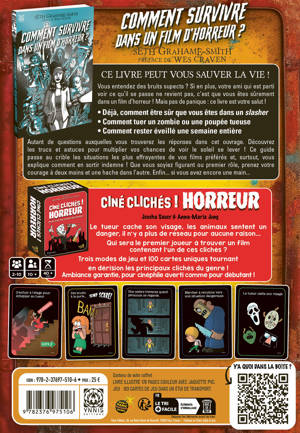 Passez une parfaite soirée frissons grâce à ce coffret spécialement conçu pour survivre aux pires tueurs et autres atrocités sortis des films d’horreur ! Avec le jeu de cartes Ciné Clichés Horreur, chassez les clichés dans vos films préférés pour gagner la partie. Et pas de panique, le livre illustré Comment survivre dans un film d’horreur ? vous permettra de rester en vie jusqu’à l’aube sans trop de soucis !