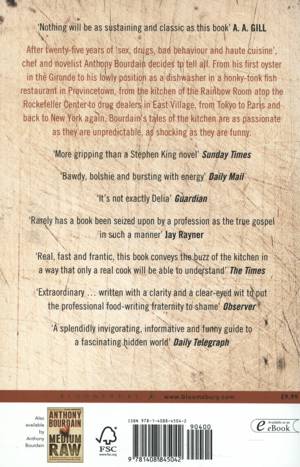 After twenty-five years of 'sex, drugs, bad behaviour and haute cuisine', chef and novelist Anthony Bourdain has decided to tell all. From his first oyster in the Gironde to his lowly position as a dishwasher in a honky-tonk fish restaurant in Provincetown; from the kitchen of the Rainbow Room atop the Rockefeller Center to drug dealers in the East Village, from Tokyo to Paris and back to New York again, Bourdain's tales of the kitchen are as passionate as they are unpredictable, as shocking as they are funny.
