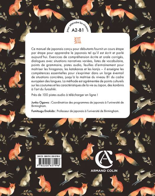 Ce manuel de japonais conçu pour débutants fournit un cours étape par étape pour apprendre le japonais tel qu’il est écrit et parlé aujourd’hui. Exercices de compréhension écrite et orale corrigés, dialogues avec situations narratives variées, listes de vocabulaire, points de grammaire, pistes audio, feuilles d'entraînement pour maîtriser les hiraganas, les katakanas et les kanjis... Il enseigne les compétences essentielles pour s’exprimer dans un large éventail de situations concrètes, jusqu'à la maîtrise du niveau B1 du Cadre européen des langues. La méthode est agrémentée de points culturels sur les coutumes et les caractéristiques de la vie au Japon.