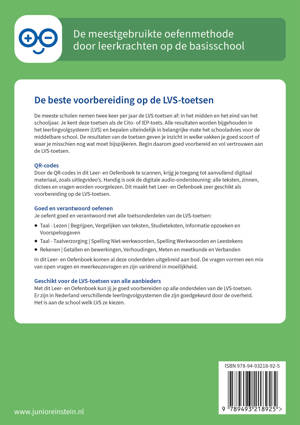 Dit Leer- en Oefenboek is full colour, net als de LVS-toetsen. Het boek bevat verschillende soorten teksten, spellingoefeningen en een groot aantal rekenopgaven. Ook in het dagelijks leven komt je kind allerlei soorten teksten tegen, moet het grammaticaal juiste zinnen kunnen schrijven en rekenproblemen kunnen oplossen. Dankzij de afwisselende, leuke en relevante inhoud sluit dit Leer- en Oefenboek goed aan bij de belevingswereld van je kind.