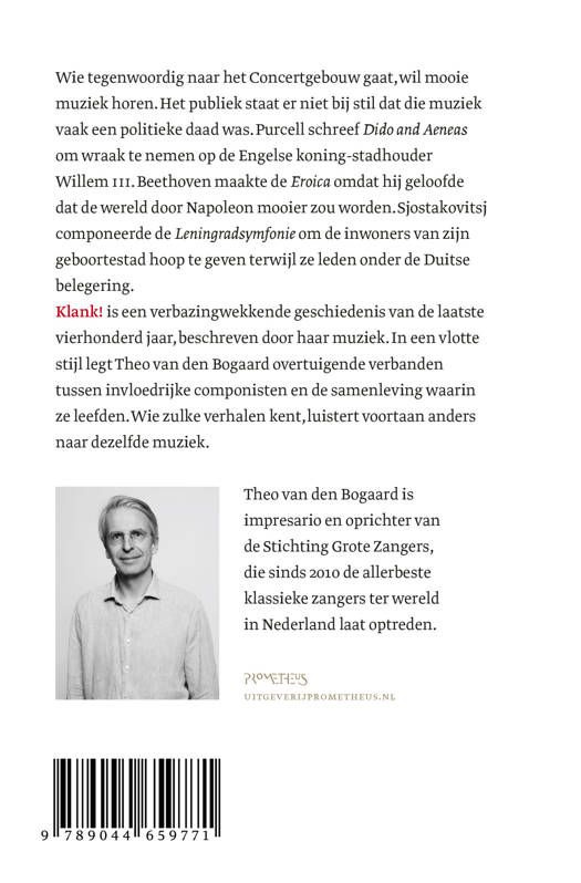 Klank! is een verbazingwekkende geschiedenis van de laatste vierhonderd jaar, beschreven door zijn muziek. In een vlotte stijl legt Theo van den Bogaard overtuigende verbanden tussen invloedrijke componisten en de samenleving waarin ze leefden. Wie zulke verhalen kent, luistert voortaan anders naar dezelfde muziek.