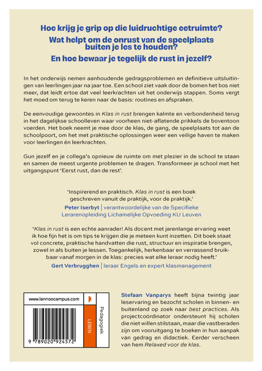 'Inspirerend en praktisch. Klas in rust is een boek geschreven vanuit de praktijk, voor de praktijk.' - Peter Iserbyt | verantwoordelijke van de Specifieke Lerarenopleiding Lichamelijke Opvoeding KU Leuven 'Klas in rust is een echte aanrader! Als docent met jarenlange ervaring weet ik hoe fijn het is om tips te krijgen die je meteen kunt inzetten. Dit boek staat vol concrete, praktische handvatten die rust, structuur en inspiratie brengen, zowel in als buiten je lessen. Toegankelijk, herkenbaar en verrassend bruikbaar vanaf morgen in de klas: precies wat elke leraar nodig heeft.' - Gert Verbrugghen | leraar Engels en expert klasmanagement