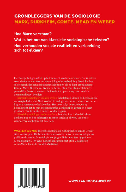 Marx, Durkheim en Weber: grondleggers van de sociologie Hoe Marx verstaan? Wat is het nut van klassieke sociologische teksten? Hoe verhouden sociale realiteit en verbeelding zich tot elkaar? Ideeën zijn het gedurfdst op het moment van hun ontstaan. Dat is ook zo voor ideeën ontsproten aan de sociologische verbeelding. Nooit liet het sociologisch denken zo'n ideeënrijkdom zien als bij haar grondleggers: Comte, Marx, Durkheim, Weber en Mead. Stuk voor stuk ambitieuze, gevaarlijke denkers, waarvan de ideeën tot op vandaag ons beeld van de maatschappij bepalen. Klassieke sociologen en hun erfenis schetst hun ideeën en het klassieke sociologisch denken. Niet, zoals al te vaak gedaan wordt, als een verzameling van versteende denkbeelden. Het boek volgt de sociologen op het moment dat ze hun meest gedurfde denkstappen zetten en nodigt je uit om mee te denken en zelf verder te gaan. Klassieke sociologen en hun erfenis laat zien hoe invloedrijk deze denkers zijn en hoe belangrijk ze tot op vandaag blijven. Vaak juist wanneer we dat het minst beseffen.